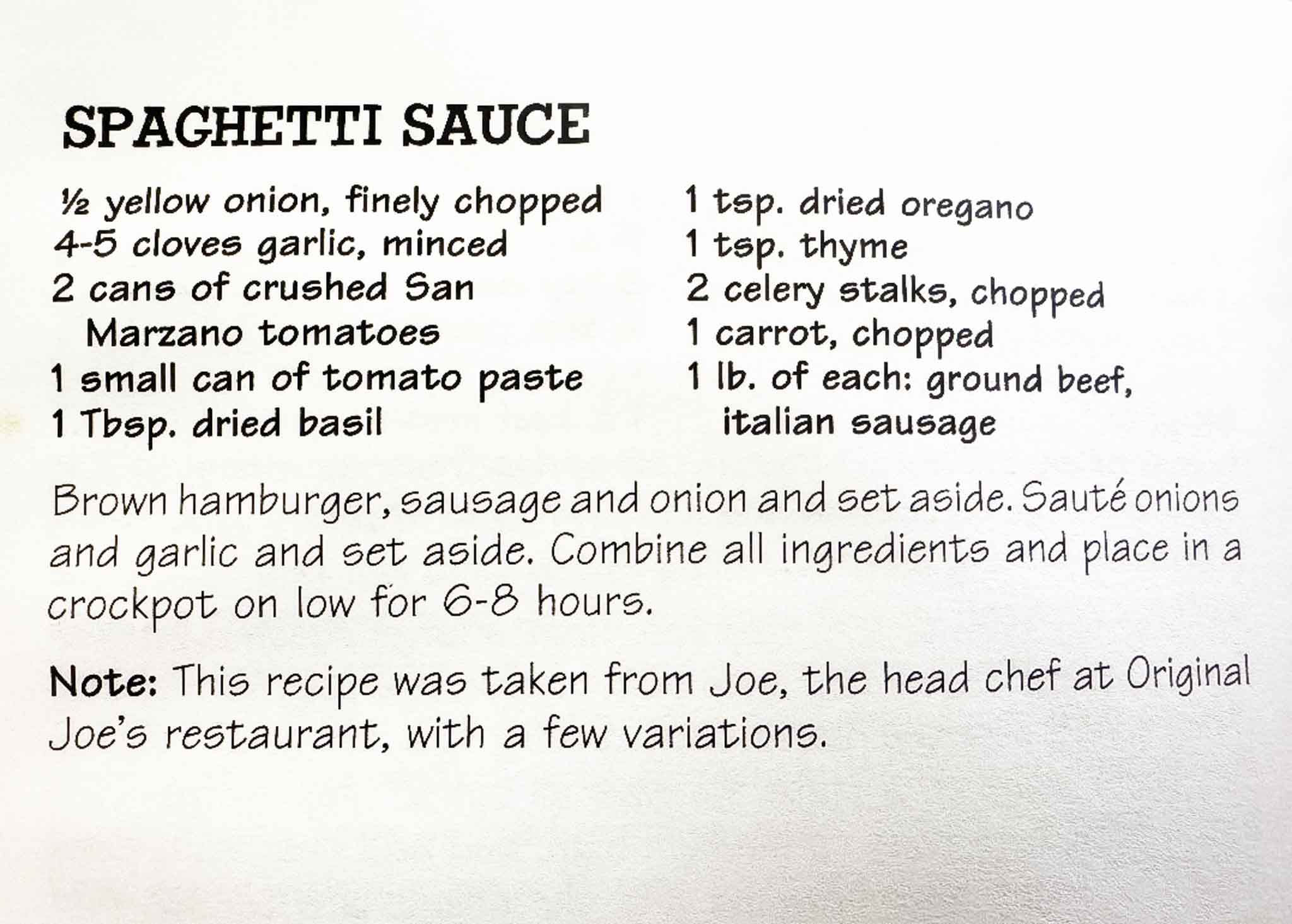 There were so many compliments about the spaghetti at the Spaghetti Feed, we had to share it. So even if you weren’t able to join us, you can still enjoy it at home! This recipe comes from Diane King, AA Padres Grandma, adapted from the original Original Joe’s in San Jose.